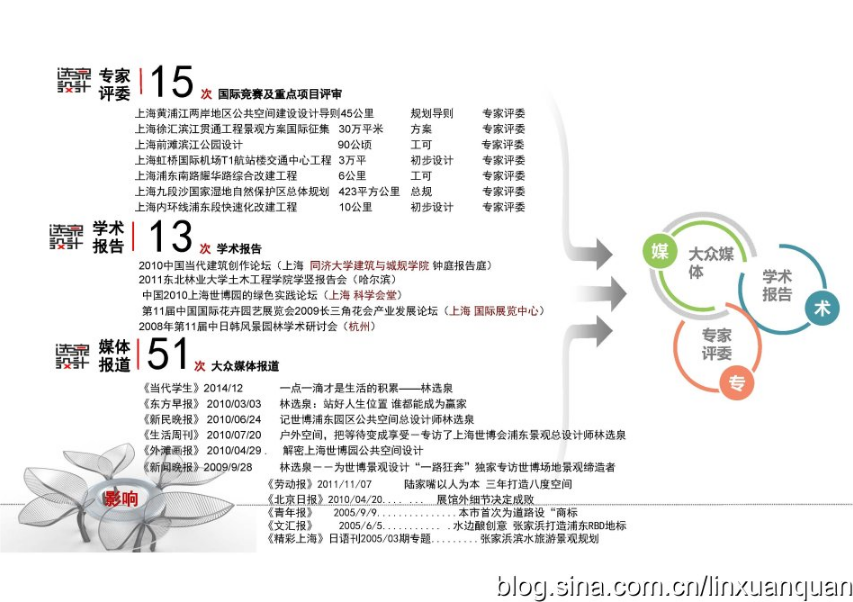 選泉團(tuán)隊(duì)在上海浙江江西新疆等地完成100余項(xiàng)規(guī)劃設(shè)計(jì),20余次在國(guó)際國(guó)內(nèi)競(jìng)標(biāo)中折桂,擁有10余項(xiàng)專利,在建筑、園林、景觀等期刊上發(fā)表論文與作品50多篇并得到媒體40多次報(bào)道,設(shè)計(jì)作品在各領(lǐng)域獲獎(jiǎng)10余次,是上海世博會(huì)場(chǎng)地、陸家嘴金融城公共空間、上海張家浜楔形綠地、上海中心大廈外環(huán)境總設(shè)計(jì)團(tuán)隊(duì),為2013年度景觀優(yōu)秀設(shè)計(jì)TOP50強(qiáng)機(jī)構(gòu)。