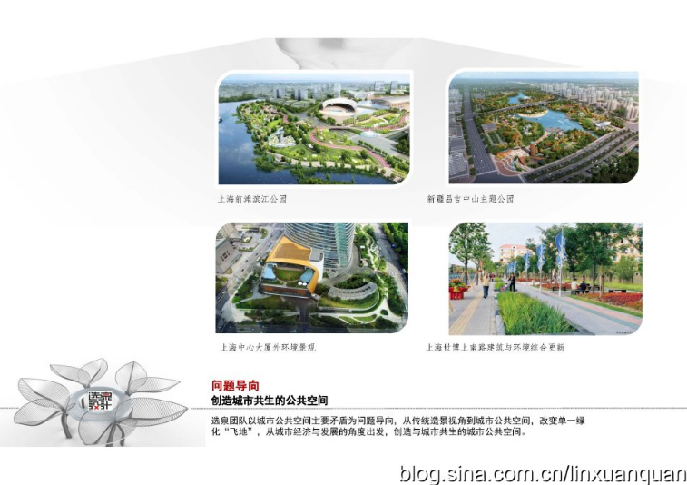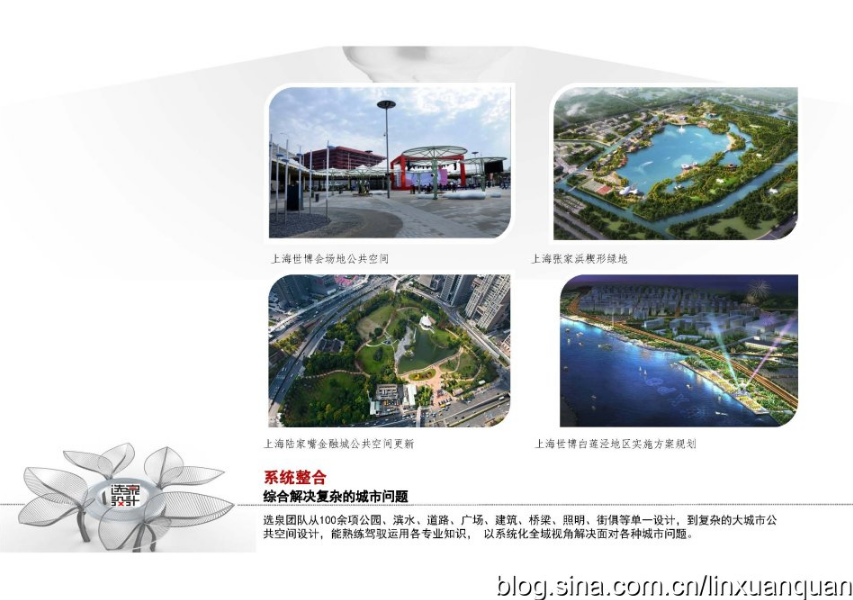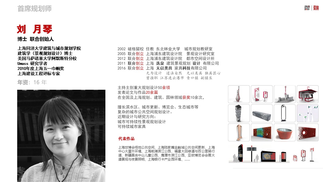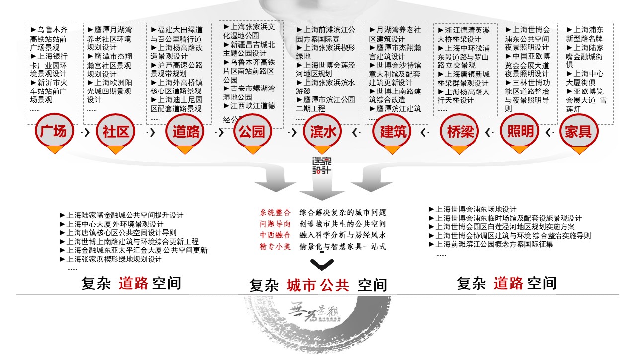 上海世博會(huì)場(chǎng)地公共空間、上海陸家嘴金融城公共空間更新、上海中心大廈外環(huán)境、上海張家浜楔形綠地、上海前灘濱江公園、上海唐鎮(zhèn)新城公共空間、福建大田綠道與百公里騎行道、新疆昌吉城北主題公園、昌吉CBD環(huán)境、鷹潭市濱江公園、亞歐博覽會(huì)會(huì)展大道景觀與夜景照明、上海銀行卡產(chǎn)業(yè)園環(huán)境、世博上南路建筑與環(huán)境更新、鷹潭市杰翔瀚宮建筑與景觀、鷹潭市月湖灣養(yǎng)老社區(qū)建筑與景觀、江西吉安螺湖灣濕地公園、陸家嘴金融城城市街具設(shè)施、上海浦東新型路名牌……