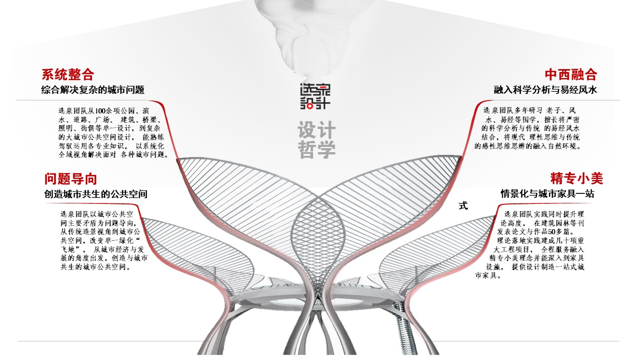 選泉團(tuán)隊(duì)實(shí)踐同時(shí)提升理論高度,在建筑園林等刊發(fā)表論文與作品50多篇。理論落地實(shí)踐建成幾十項(xiàng)重大工程項(xiàng)目,全程服務(wù)融入極致小美理念并能深入到街具設(shè)施,提供設(shè)計(jì)制造一站式城市街具。