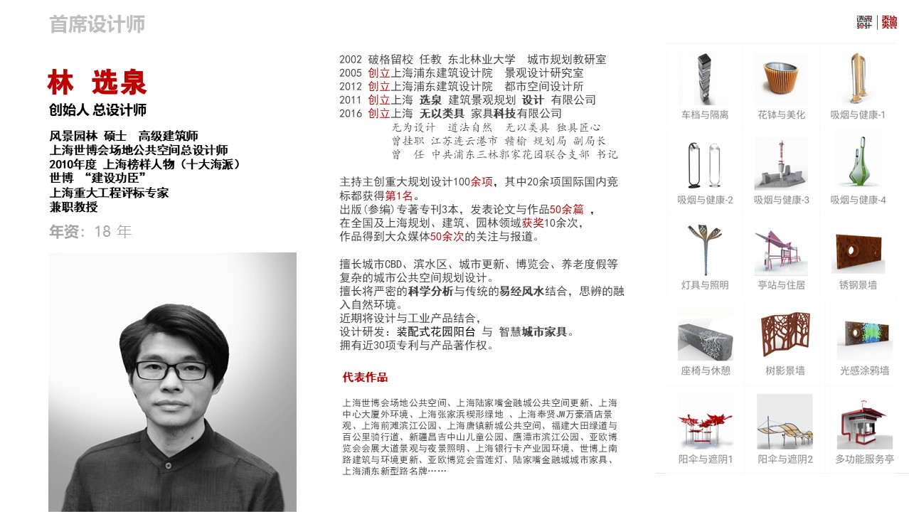 公司由2010上海榜樣人物、上海世博會(huì)公共空間總設(shè)計(jì)師林選泉與同濟(jì)大學(xué)建筑城規(guī)學(xué)院博士、美國(guó)Umass研究學(xué)者劉月琴共同創(chuàng)立。融合風(fēng)景建筑及工業(yè)設(shè)計(jì)專業(yè),以城市開放性公共空間設(shè)計(jì)為核心,城市個(gè)性化系統(tǒng)性家具設(shè)計(jì)為特色。