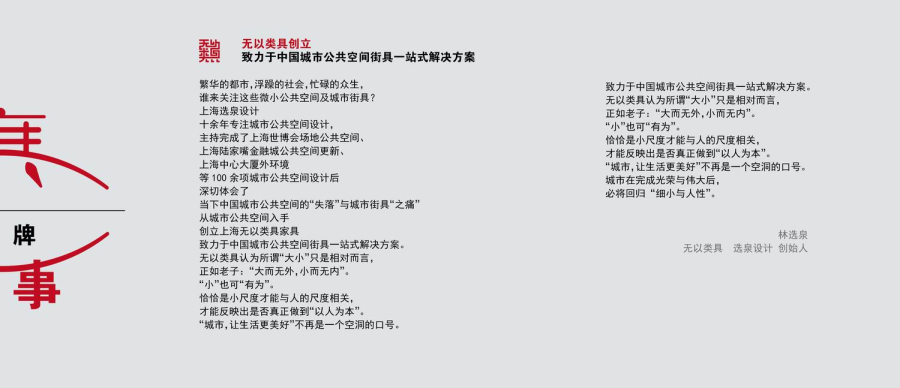 公司由2010上海榜樣人物、上海世博會(huì)場地公共空間總設(shè)計(jì)師林選泉與同濟(jì)大學(xué)建筑城規(guī)學(xué)院博士、美國Umass研究學(xué)者劉月琴共同創(chuàng)立。融合風(fēng)景建筑及工業(yè)設(shè)計(jì)專業(yè),以城市開放性公共空間設(shè)計(jì)為核心,以城市街具策劃設(shè)計(jì)制造一站式解決方案為特色。